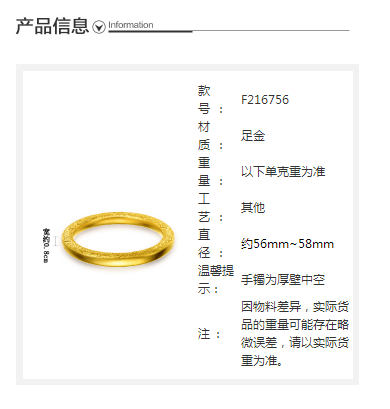 规格: 足金 工费5580元 56mm 足金 工费5580元 58mm    货号: F216756