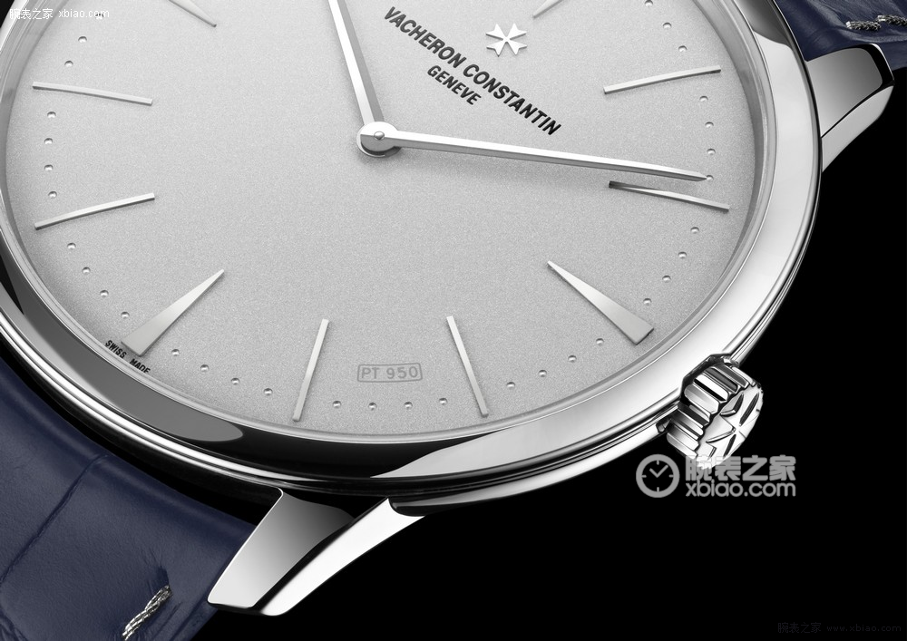 表盘材质950铂金 、喷沙装饰、在4时与5时中间铸有« PT 950 » 字样、经细致打磨的分钟刻度外圈、18K白金小时刻度